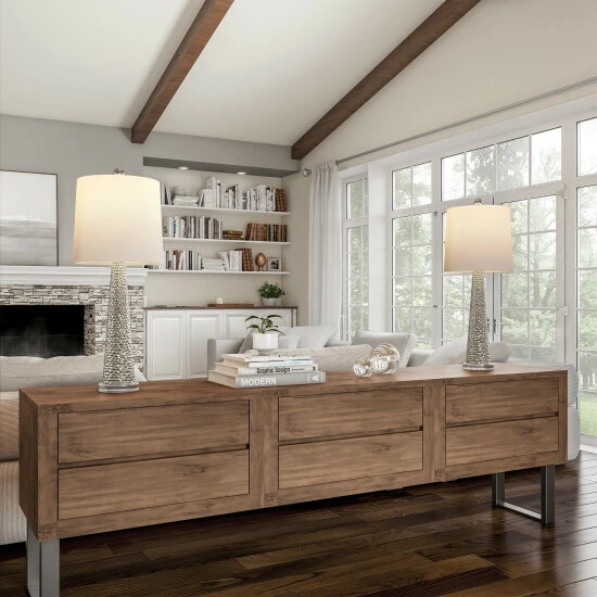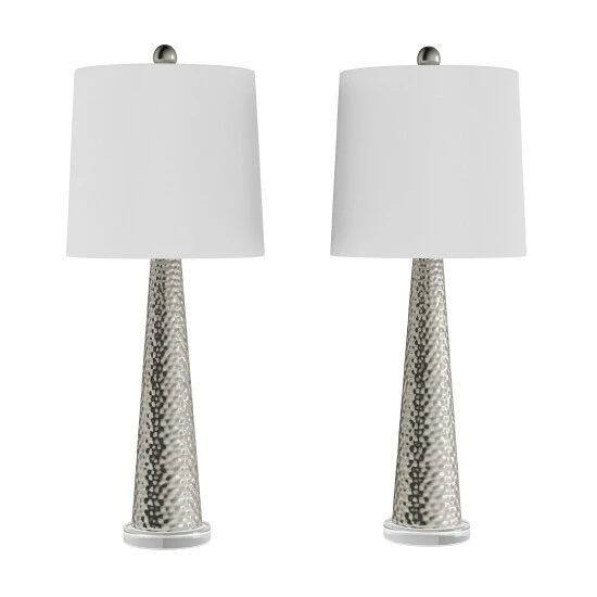 Instantly transform your space with stylish form and function with this elegant and unique Set of 2 Hammered Glass Table Lamps. With a chic cone shaped glass base with hammered detailing awash in metallic silver finish and complementing ivory fabric shade, the stylish lamps provide warm ambient lighting for your entryway, bedroom, living room or home office.