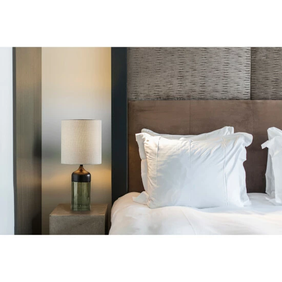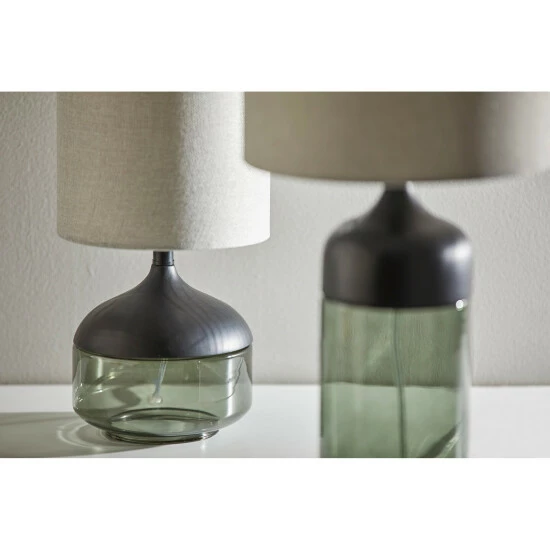 Black wood and smoked glass make up the contemporary design of the Tall Table Lamp. This lamp is the perfect option to add a modern accent to the living or bedroom. A light textured grey fabric softens the look, illuminating with a soft glow. A simple rotary switch on the socket turns the lamp on and off.Bulb is not included.