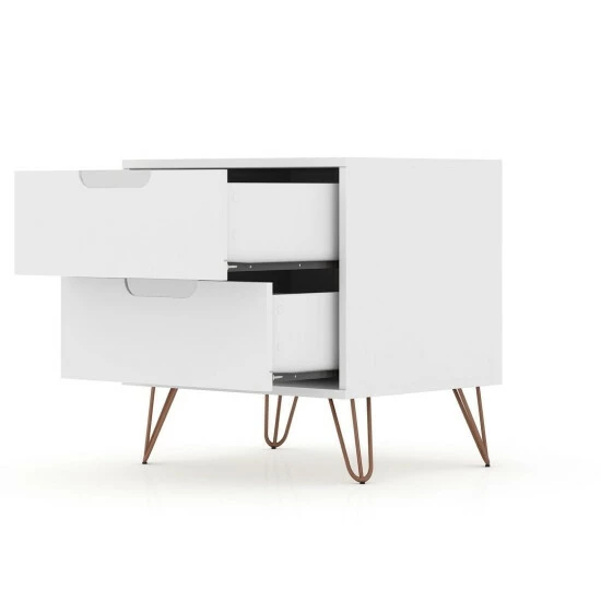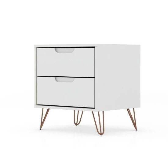 The nightstand is the perfect bedside table, with two drawers that are ideal for tucking away personal items, tablets, books, and beyond. Versatile in design with Mid-Century clean lines and modern splayed metal legs, this piece blends well with any existing decor and can be used from space to space.