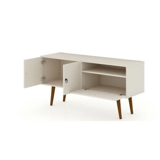 Part dresser, part living room entertainment focal point, the TV stand is Mid-century modern at its best, and is as versatile as it is functional. This piece couples as a dresser and easily showcases your television, tucking away any media accessories in the concealed shelving space, while an open shelf perfectly fits a DVD player or laptop. In the bedroom or in the living room, stow throw blankets, clothing, or table linens, this piece goes easily from space to space and blends with existing decor to create a statement. Splayed legs and clean lines make for a seamless look.