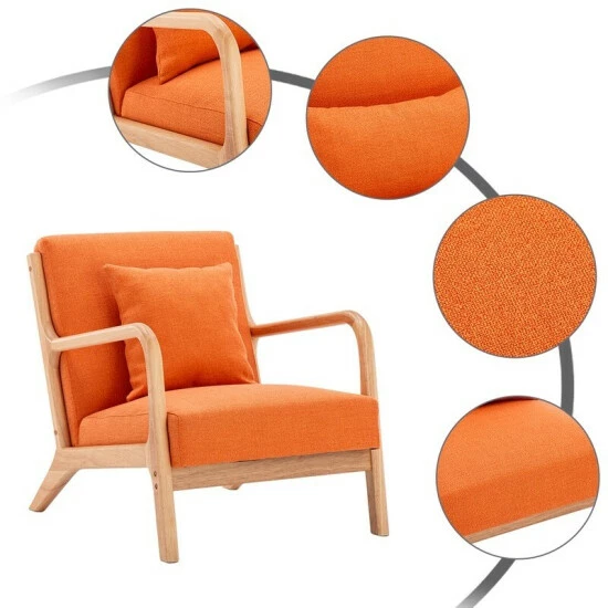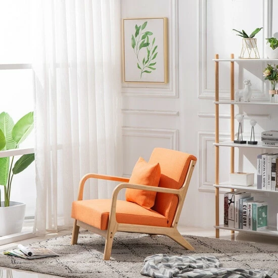 Add some extra seating to your home with this modern lounge chair. This chair is available in a bold orange color and sturdy and solid wooden legs.The seat is supported by a spring, which is soft and flexible, and has a large bearing. This chair is perfect for your living room, study, bedroom and other leisure areas.