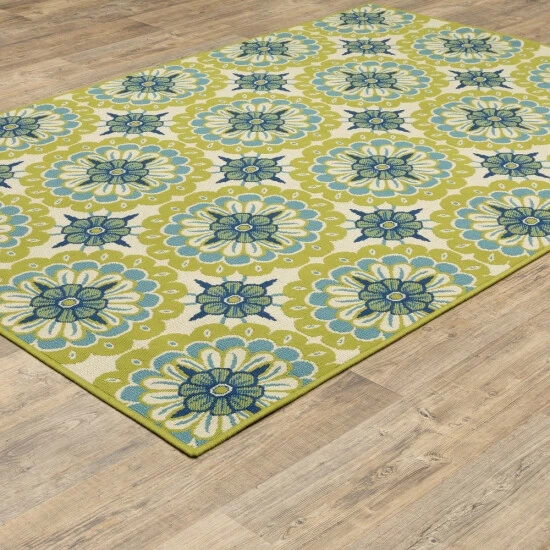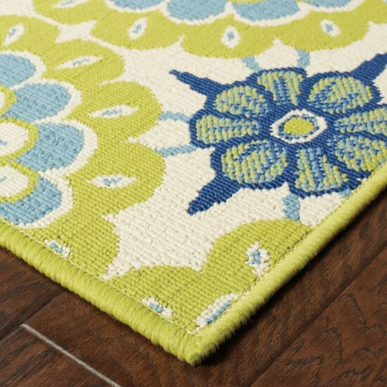 This fabulous, eye-catching area rug features shades reminiscent of the Mediterranean and a durable polypropylene material that endures the elements. Its distinctively elegant print offers a dash of feminine charm.