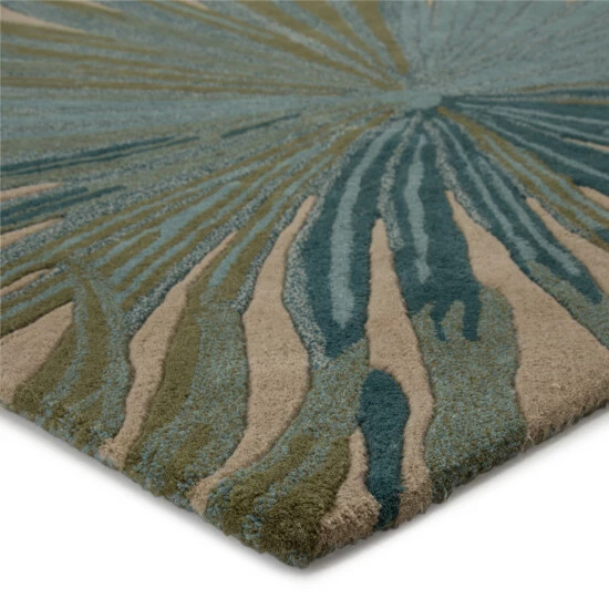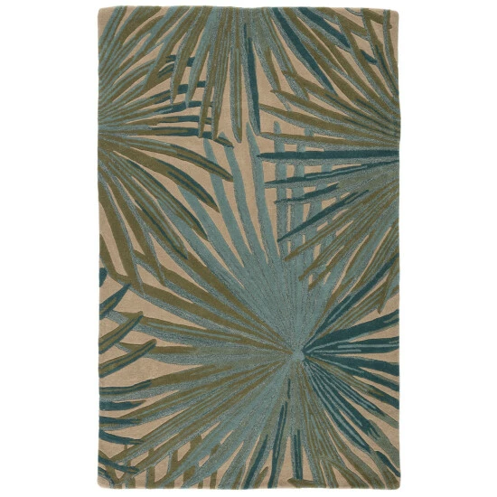 Embrace a tropical appeal with the Mariehamn area rug from Carson Carrington. Featuring a large palm leaf pattern in calming blue and green hues, this rug will add a tropical vibe to any space. The hand-tufted wool pile is extraordinarily soft and durable.ย