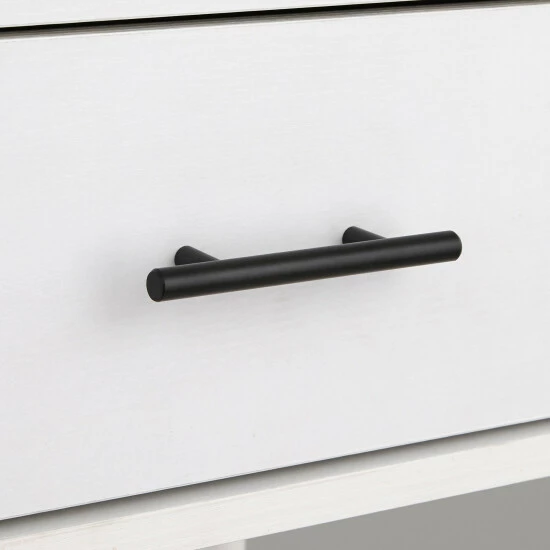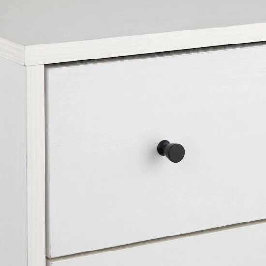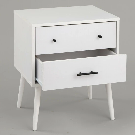 The Maylis Nightstand offers convenient bedside storage in a sleek, mid-century inspired design. Two drawers keep our essential bedside items or clothing within reach. Crafted of laminated particle board and solid wood legs, the nightstand is finished in white, contrasted by black hardware. The top drawer is accented by round black knobs; lower drawer features straight pull handles. Legs are angled and tapered downward, giving the dresser a mid-century modern look. Matching 4-drawer dresser sold separately.
