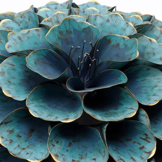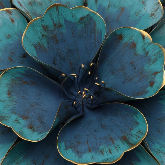 - Each flower petal has a distressed teal blue finish with gold tip accents.