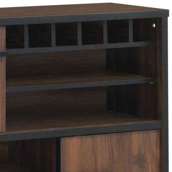 Infuse your decor with the vintage inspired appeal of this mid-century modern wine cabinet. Delicate wines will be kept safe and sound in the built-in wine holder with space for six bottles. Two sliding cabinet doors keep belongings concealed and neatly tucked away. Six shelves offer all the space you need to keep cocktail party essentials in one place. From the rich walnut finish to the bold black accents to the eye-catching angled legs, this stylish piece exudes classic character and charm.