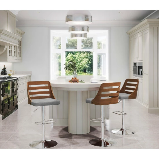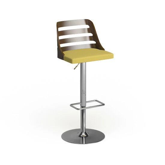 Give your decor a bold update with this beautiful bar stool. Featuring a ladderback design and a sleek chrome-finished base, the stool enhances any space with mid-century modern elegance. The upholstery is available in grey or green to match your decor, and the adjustable height, swivel, and footrest offer versatile comfort.