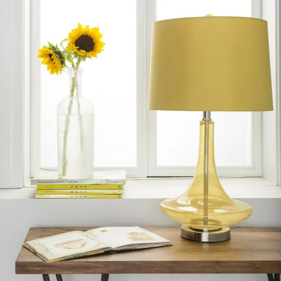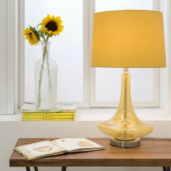 Illuminate your home with the unique flair of this vibrant table lamp. The transparent gold colored glass base and coordinating satin shade perfectly utilize the light to create the appearance of liquid sunshine. A charming addition to any decor, the lamp works especially well in mid-century designs.