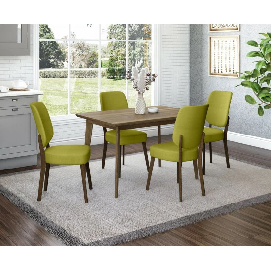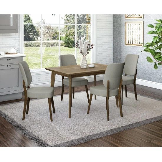 Inspired by Scandinavian design, this 5-piece dining set includes a rectangular table with a beveled edge in a walnut finish and 4 armless upholstered chairs. Perfect for everyday dining or entertaining, the table seats up to 4 comfortably, and has a versatile design that is equally at home in the kitchen or dining room. It’s sturdily constructed with an engineered veneer tabletop. Classic and understated, the set of 4 armless side chairs celebrates the clean lines and simple design elements of minimalistic style.