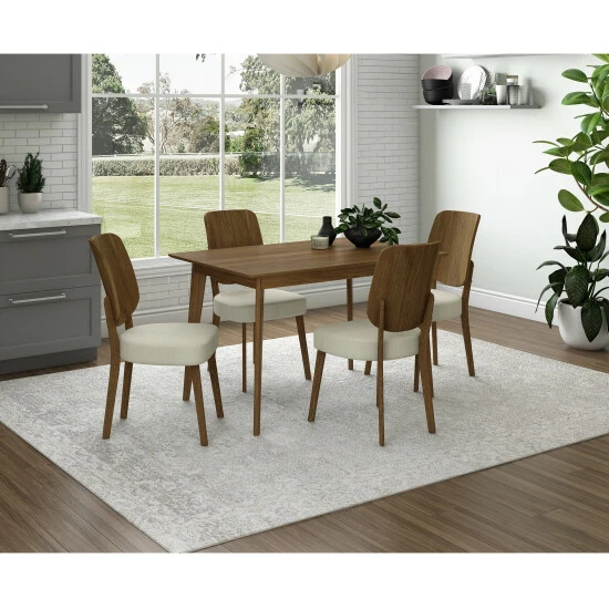 Inspired by Scandinavian design, this 5-piece dining set includes a rectangular table with a beveled edge in a walnut finish and 4 armless chairs. Perfect for everyday dining or entertaining, the table seats up to 4 comfortably, and has a versatile design that is equally at home in the kitchen or dining room. It’s sturdily constructed with an engineered veneer tabletop. Classic and understated, the set of 4 armless side chairs celebrates the clean lines and simple design elements of minimalistic style.