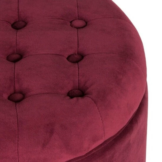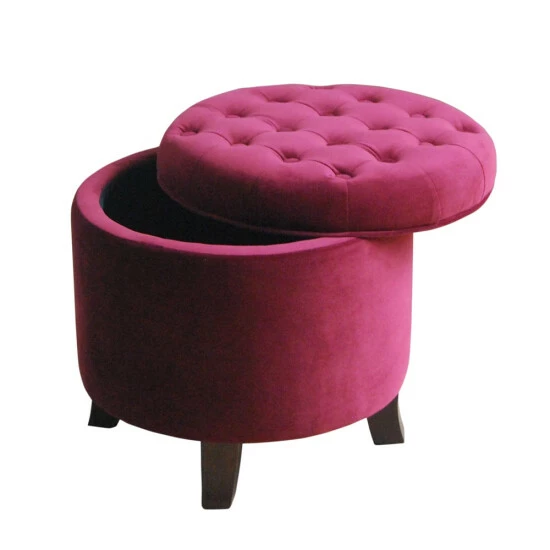 This Velvet Tufted Round Ottoman features a lift-off lid with all over button tufting for classic style. Upholstered in soft and durable velvet in a rich burgundy red, this elegant round ottoman has wood legs in a rustic brown finish. Use as a storage ottoman to hide accessories in a bedroom, to store books or magazines in a living room, or to keep controllers or remotes nearby but out of sight. Pair two together for added impact. Our tufted ottoman is available in a range of rich velvet colors with coordinating accent items in the same hue. Easy to assemble and maintain.ย
