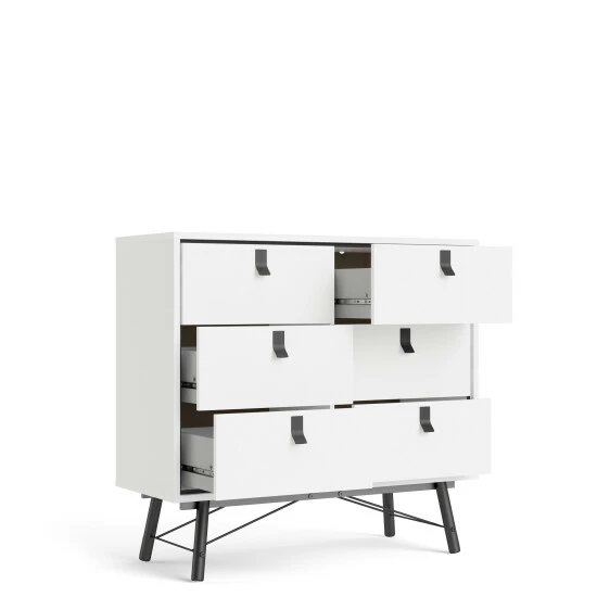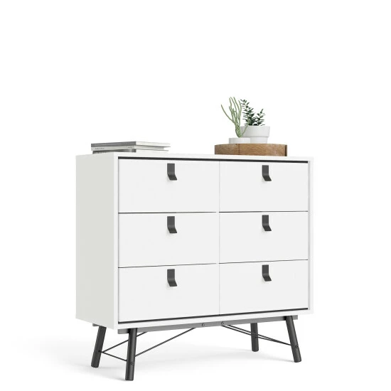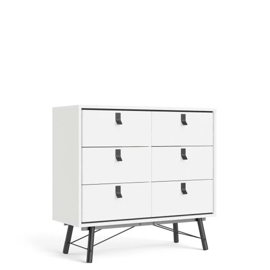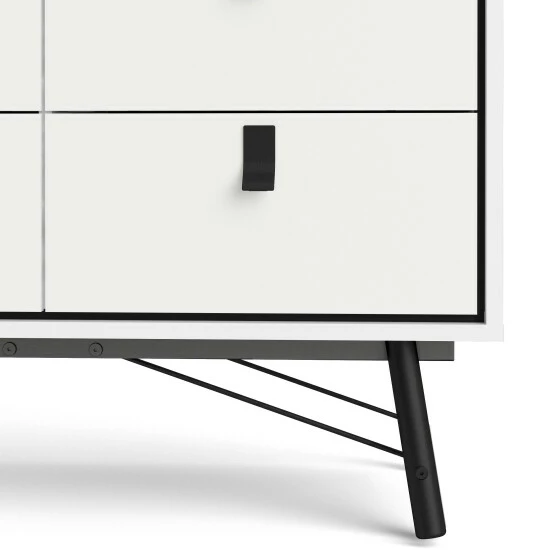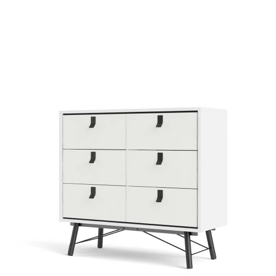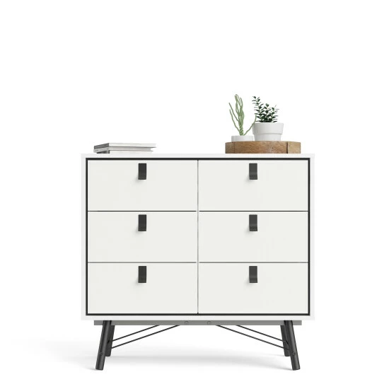 Create a calming atmosphere with the Ry 6 Drawer Chest Dresser. Inspired by the tranquility of Ry, a small Danish city. The chest offers six drawers for concealed storage while the black metal handles allows for easy opening and closing. The two tone inner frame and angled solid wood legs connected by black metal bars mimics the sunlight shining through the leaves on a forest walk. The Ry collection is Danish designed with the calming, crisp air of Ry never far from mind and made in easy-to-clean foil surface. Pair this chest with other items from the Ry collection to create a tranquil bedroom.