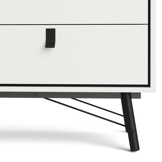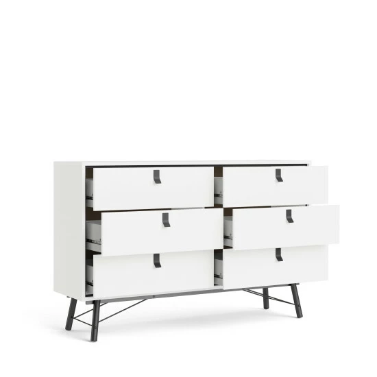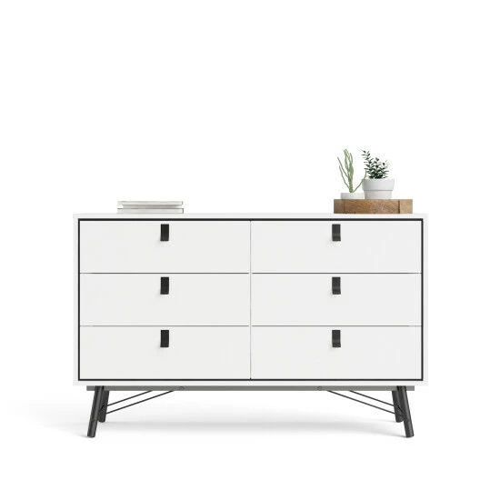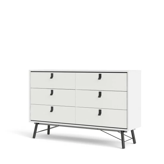 Create a calming atmosphere with the Ry 6 Drawer Double Dresser. Inspired by the tranquility of Ry, a small Danish city. The dresser offers six drawers for concealed storage while the black metal handles allows for easy opening and closing. The two tone inner frame and angled solid wood legs connected by black metal bars mimics the sunlight shining through the leaves on a forest walk. The Ry collection is Danish designed with the calming, crisp air of Ry never far from mind and made in easy-to-clean foil surface. Pair this dresser with other items from the Ry collection to create a tranquil bedroom.