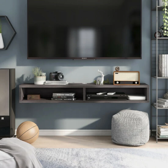Saving space while looking supremely sophisticated, this wall-mounted TV stand features a floating illusion while providing a visual into your displayed media decorations. Available in four finishes, this media console, while not designed to support a TV, offers two spacious shelves and built-in wire management. Make a splash in your space with this crisp, modern console.