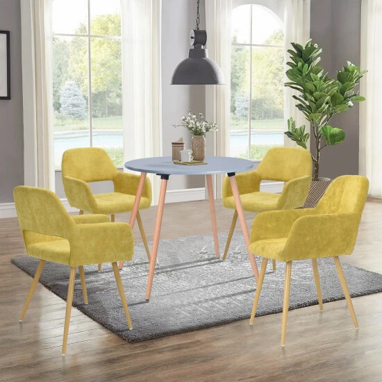 With angular, contoured seats and gently tilted, open back, this dining armchair twosome boasts gently flared armrests and beautiful fabric upholstery in your choice of five gorgeous hues. Their tapered metallic legs, finished with a light, natural, wood-like finish, splay outwards, for robust, dependable support.