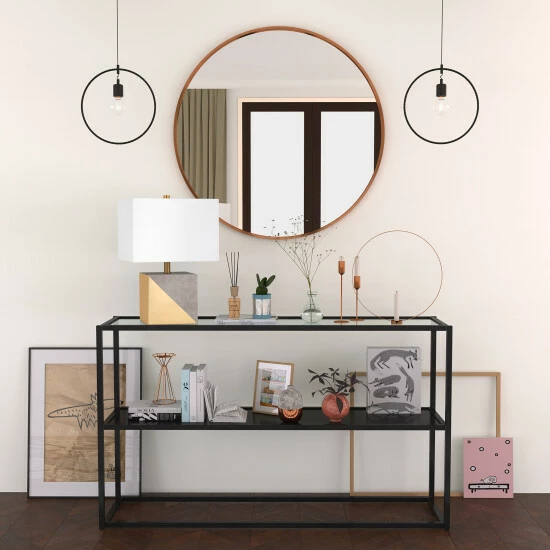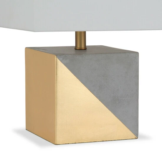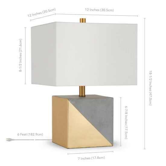 This table lamp creates a refined industrial look with its dipped gold concrete base.โข The base is forged in concrete and finished with a gold dip.โข It is paired with a French rectangular shade.โข The shade is in a crisp chiffon white color and is made of 100% linen with polystyrene lining for durability.โข Rated for one 60W incandescent bulb; 9W LED bulb, 13W fluorescent (CFL) bulb, or 9W self-ballasted LED bulb. E26-base bulb.โข Includes a 6 ft. cord.โข Clean with a soft, dry cloth; no harsh chemicals or abrasive cleaning materials.