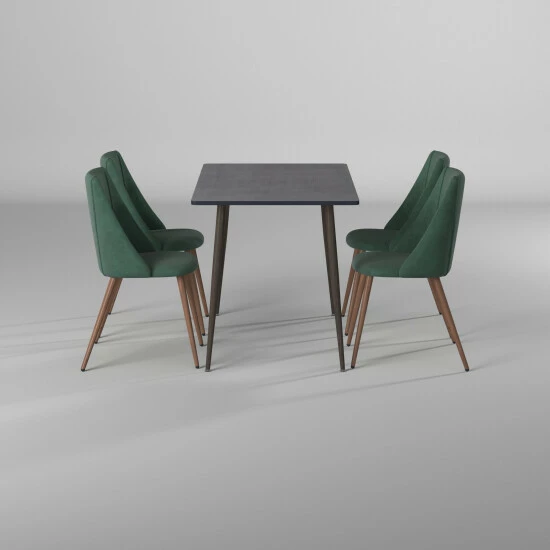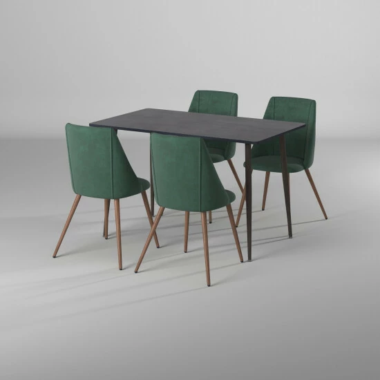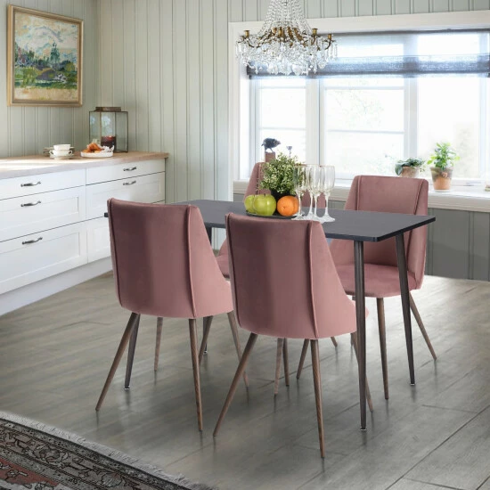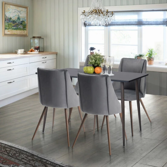 Make the most of your dining room with this five-piece set, featuring a table and four chairs. Each of the chairs features splayed metal legs, while the comfortable, curved seats are wrapped in soft fabric. The manufactured wood table stands atop tapered metal legs and offers plenty of room for you to spread out with your latest meal.ย