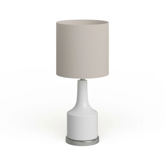 This winsomely crafted table lamp features a white, versatile, chic finish and a drum-style fabric shade. A chrome finish at the base’s bottom, along with a uniquely shaped base, make for a charming home addition.