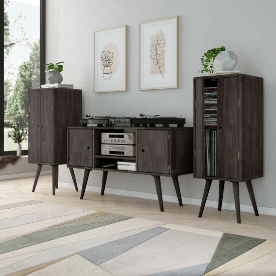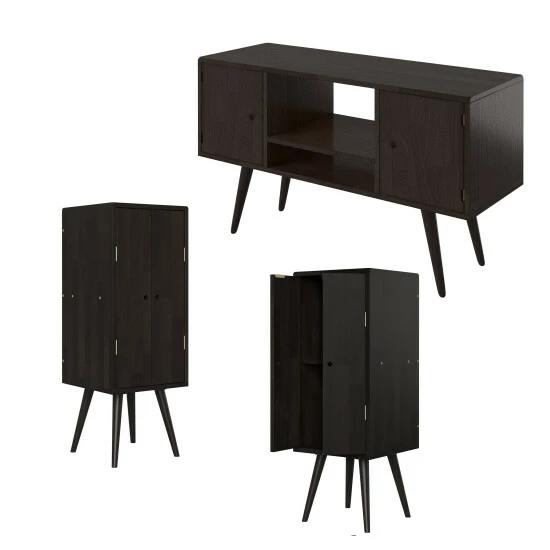 This 3-piece mid century modern solid wood set includes 2 vertical chests with doors and an entertainment cabinet with open shelves and doors. The set includes all the pieces you need to update the look of your living room or family room.