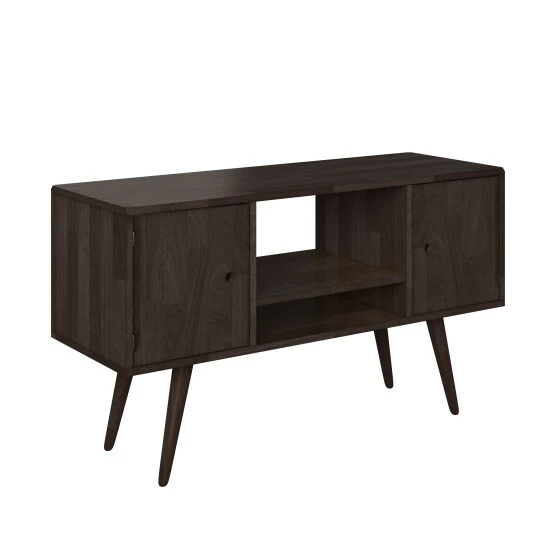 - The entertainment cabinet provides 2 open center shelves with 2 enclosed storage areas with doors and open backs for additional hidden storage plus round tapered legs flare out slightly to complete the look and provide support