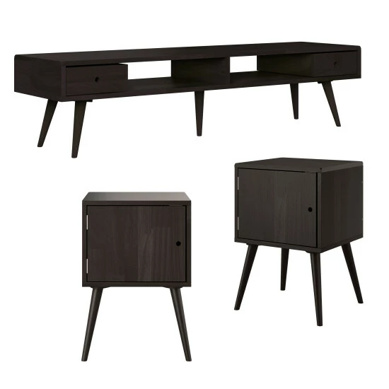 This 3-piece mid century modern set includes 2 square cabinet-style end tables with doors and a TV stand with shelves and drawers. The set includes all the pieces you need to update the look of your living room or family room.