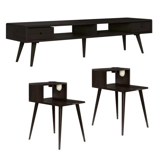 This 3-piece mid century modern set includes 2 rectangular end tables with an open shelf and a TV stand with shelves and drawers. The set includes all the pieces you need to update the look of your living room or family room.