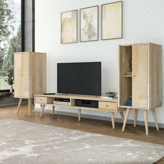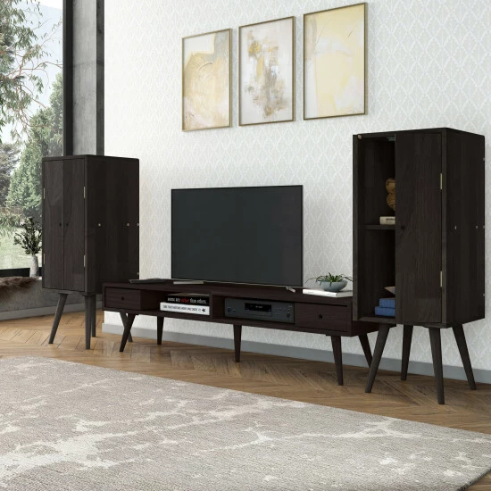 This 3-piece mid century modern set includes a wood TV stand and 2 tall wood chests. The set includes all the pieces you need to update the look of your living room or family room plus offer storage solutions.