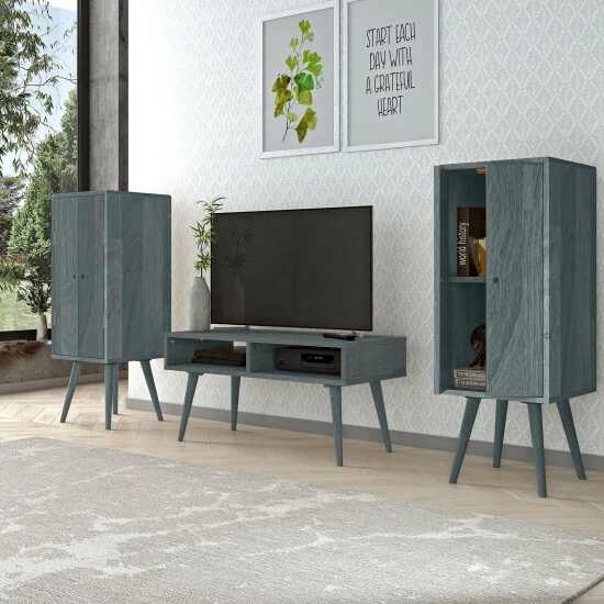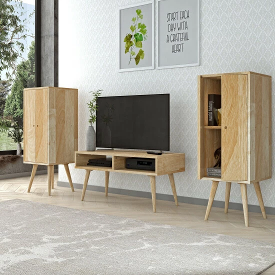 This 3-piece mid century modern solid wood set includes 2 cabinet-style square end tables and a TV stand. The set includes all the pieces you need to update the look of your living room or family room.