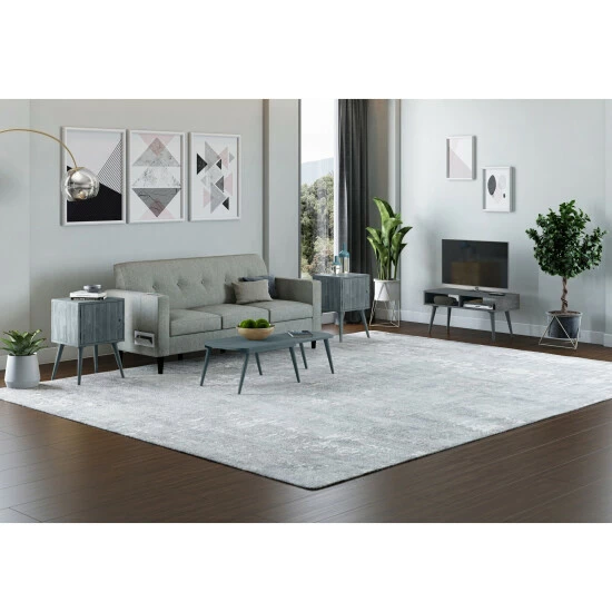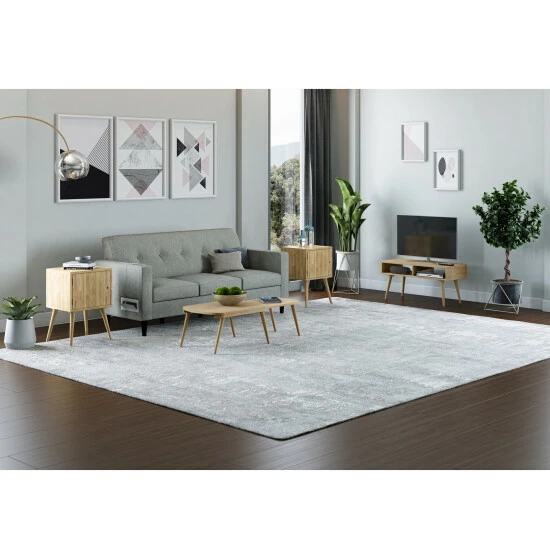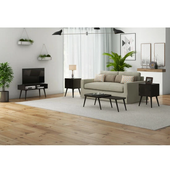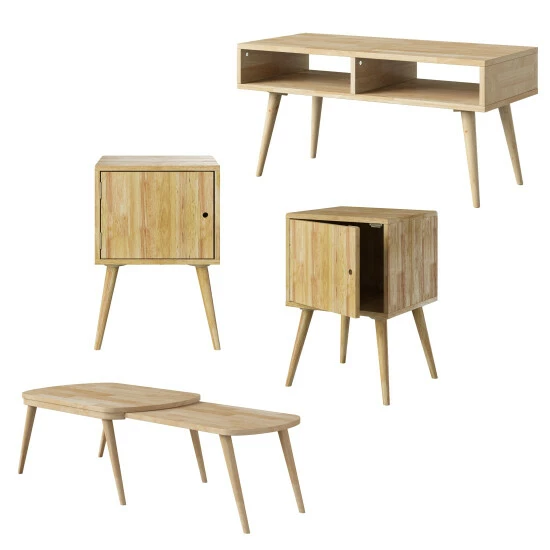 This 4-piece mid century modern set includes two square shaped end tables with doors, a rectangular shaped nesting cocktail table and a TV stand. The set includes all the pieces you need to update the look of your living room or family room.