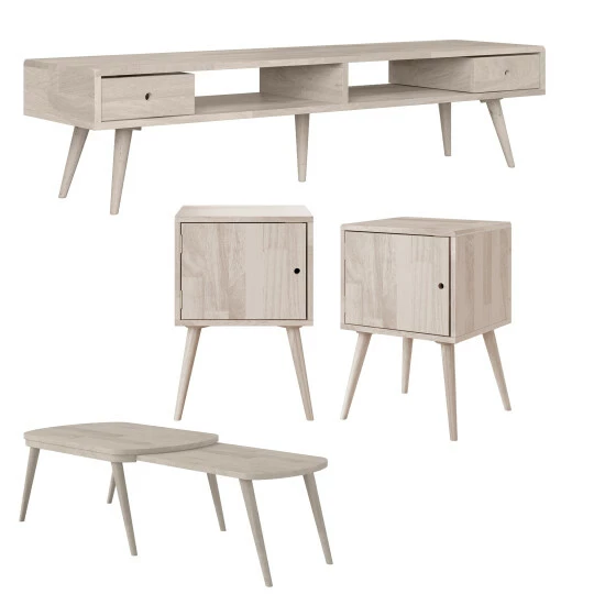 This 4-piece mid century modern set includes two square shaped end tables, an expandable nesting cocktail table and a TV stand. The set includes all the pieces you need to update the look of your living room or family room.