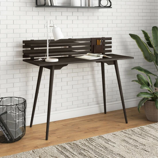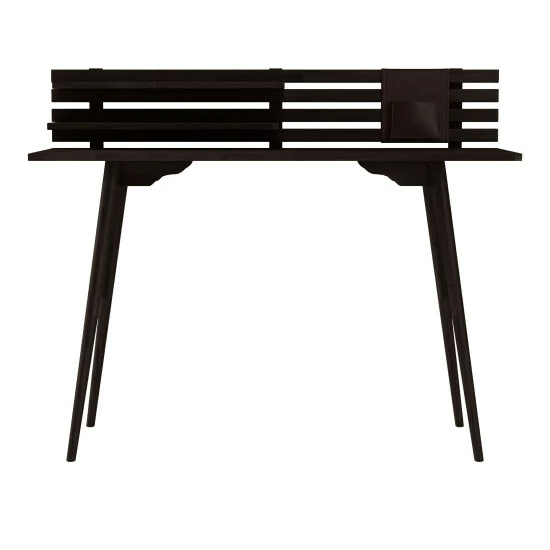 Exemplifying the streamlined simplicity of Scandinavian design, this desk is perfectly sized for smaller spaces. Features include a circular cutout in the desktop, a slatted back and 2 shelves. Constructed of solid sustainably harvested hardwood, the desk is fitted with round tapered legs.