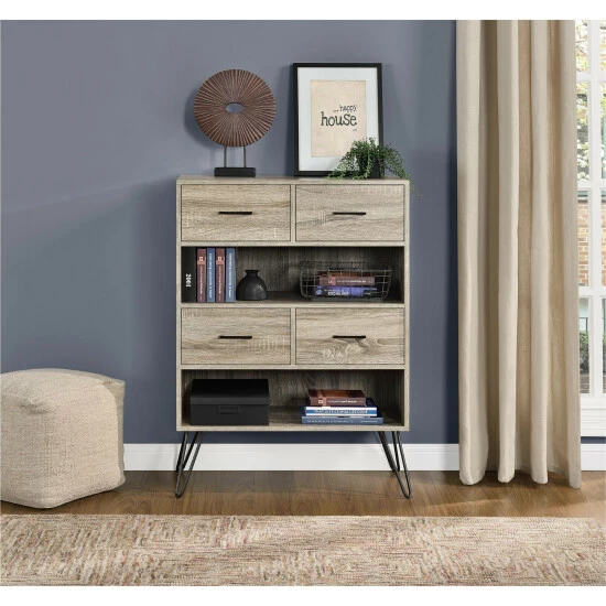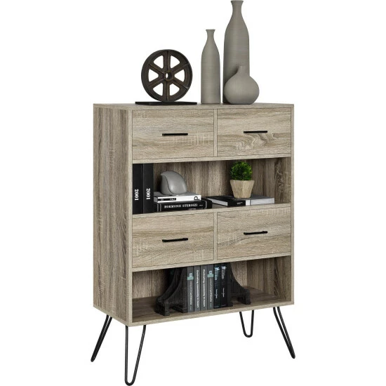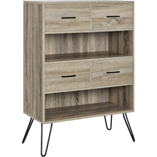 With open shelves and clean, modern lines, this Silkeborg bookcase from Carson Carrington is great for keeping your living room organized and stylish. The bookcase has two open shelves and four bins with wood grain fronts and metal handles while hairpin legs complete the mid-century modern look.