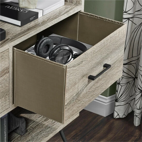 - 4 fabric bins with wood grain fronts and metal handles