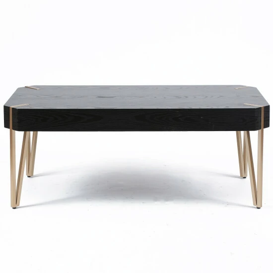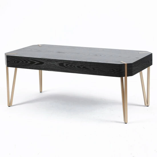 Give your home a unique-modern look with this beautiful coffee table. The tabletop is made from engineered wood and sports a black finish with visible wood grain for a two-tone aesthetic. Four metal hairpin-inspired legs support the table, and the gold finish is sure to make the beauty of this piece stand out. Whether the place for a game night or just the perfect perch for keeping drinks in easy reach, this coffee table is an essential place to gather in your living room ensemble.