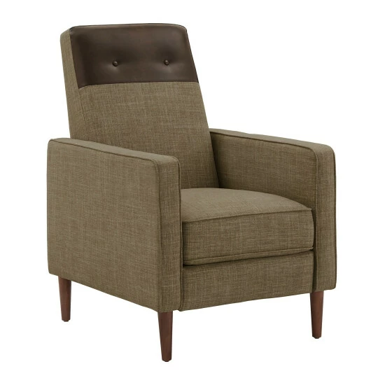 This two-tone caramel and beige push-back recliner chair is perfect for relaxing and adding major style points to your living room’s décor. It features button-tufted caramel leather accent, provided styled detailing. The soft and cozy beige upholstery is accented with a subtle, button-tufted caramel leather component which decorates the top of the chair’s back. The rubberwood construction provides ensured durability to withstand daily use.