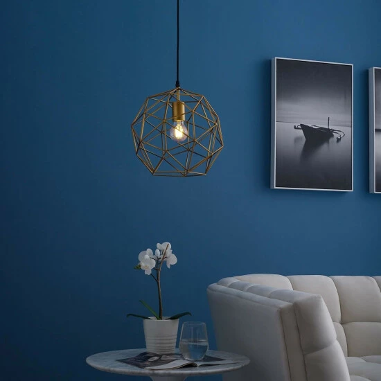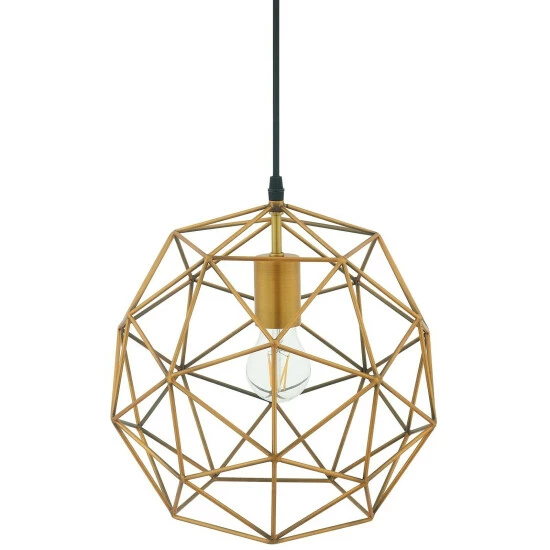 Bring contemporary style to your living space with the modern geometric design of the geometric decagon-shaped pendant light. Attracting attention in the entryway, kitchen, living room, or dining room, this contemporary ceiling light fixture displays an open decagon-shaped cage shade made of antique brass metal and comes suspended from a slightly adjustable 65” two-core braided cable. Complete with a flush wall mount, Rarity requires one E26 60W bulb (not included).