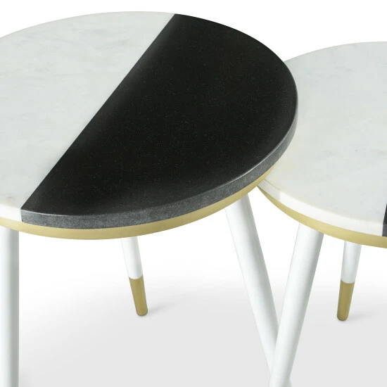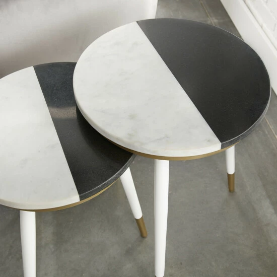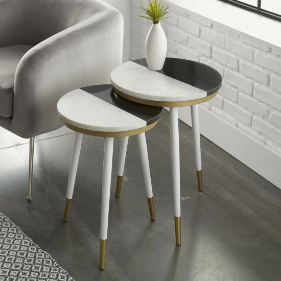 A perfect complement to today’s modern decor, these nesting tables feature a two-tone black and white marble top with gold accents and tapered, gold tipped legs. Place these tables beside your favorite comfy chair for a convenient two-tier surface.