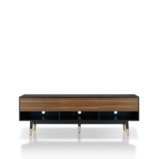 Step up your mid-century modern style with this two-tone TV stand from Carson Carrington. Made from solid wood and particle board, the black frame is fitted with three walnut-finished drawers and three open shelves for plentiful storage. Gold-tipped feet add a hint of contemporary shine and added stability.