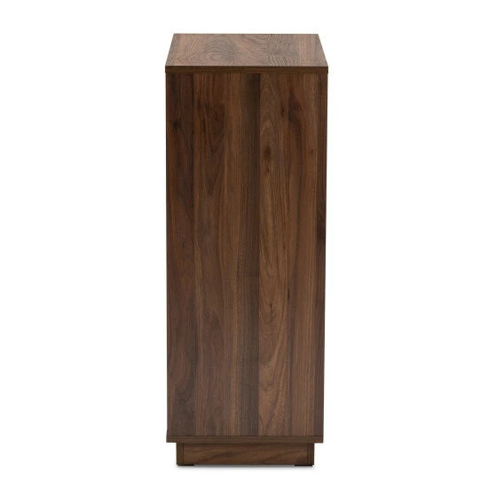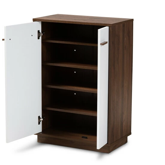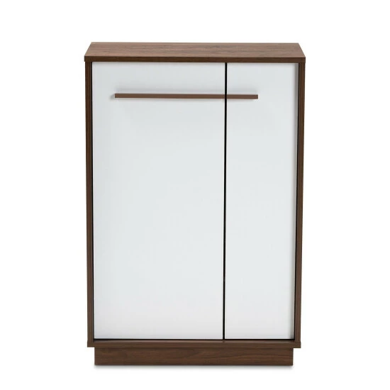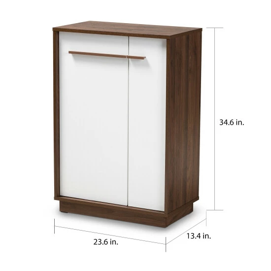 With its sleek design and exceptional craftsmanship, the shoe cabinet is a stylish storage solution. Constructed from engineered wood, the a two-tone white and walnut brown finish for a cool, contemporary feel. Two doors conceal five shelves with space to store up to 15 pairs of adult shoes.