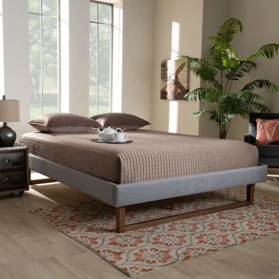 Bring mid-century modern charm to your bedroom with the mid-century fabric platform bed frame. This piece features slats, eliminating the need for a box spring, and is upholstered in padded fabric to ensure your comfort.