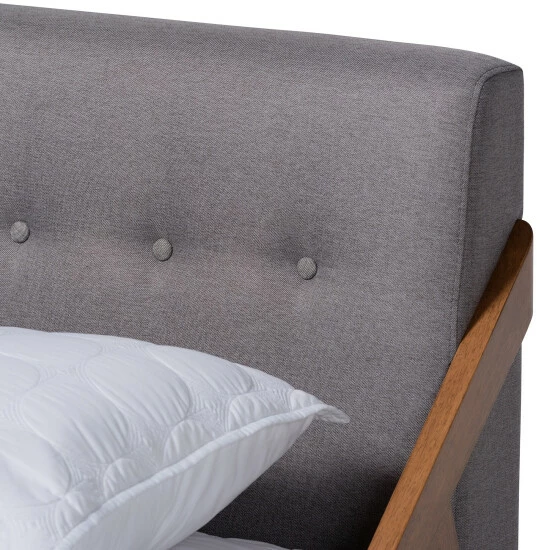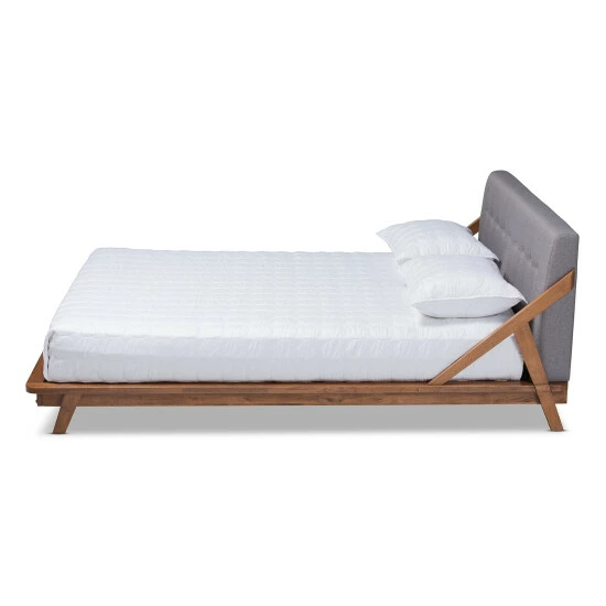 A graceful nod to mid-century modern design sits poised to adorn your bedroom with this bed. Smooth upholstery and foam padding create a cozy oasis, while the solid construction provides a robust design. Included slats offer a solid foundation for your mattress, and tufted detailing on the headboard lends depth and adds a refined touch.