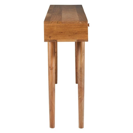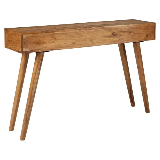 Add a multi functional piece to your home with this console table. The table features a natural brown finish and also has two drawers that provide additional storage.. The angled tapered legs make it a style and appeal. The overall body style is a nod to iconic mid-century modern design.
