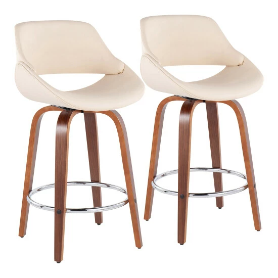 The wide and welcoming seat of this counter stool beckons one to sit and relax. A curved back and contoured upholstered seat is accented by flared walnut wood legs that add to the stylish yet comfortable design. Available in a variety of upholstery colors, choose the one that suits your space best.