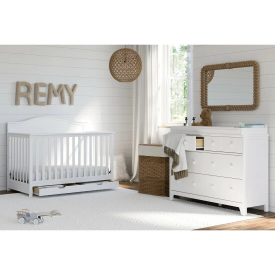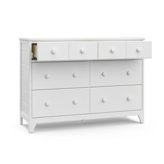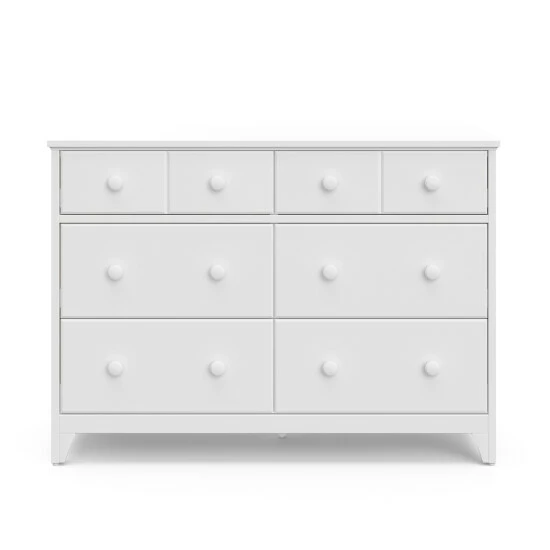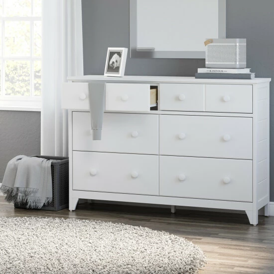 Make a charming choice for your bedroom organization with this double dresser. Complete with detailed, textured shiplap side paneling, this stylish dresser is crafted with high-quality wood and composites for years of use. The design and finishes are child safe and ready for use with easy assembly.