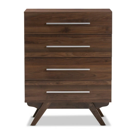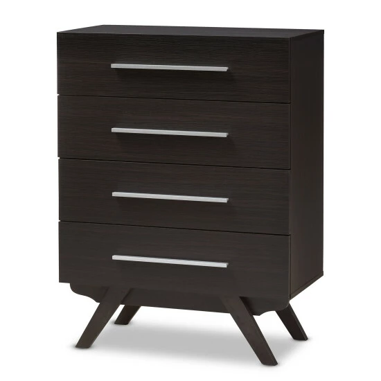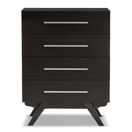 Sleek design with angular legs for sculptural design balancing, the four-drawer chest presents your everyday space with ample storage. Constructed of engineered wood and MDF boards for sturdiness, the chest features four drawers, on pre-install drawer slides for your clothes and linens. Powder-coated handle offers a sleek and modern aesthetic in your space.