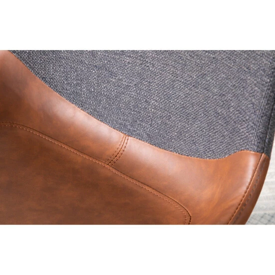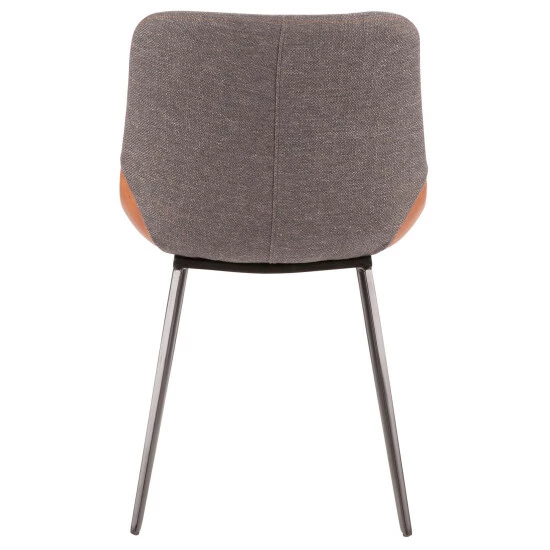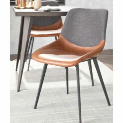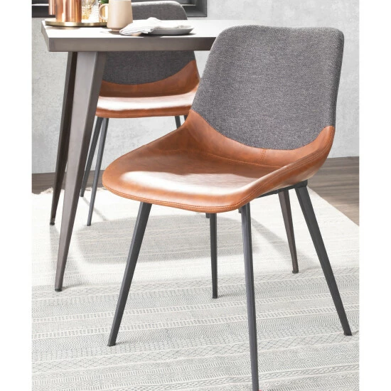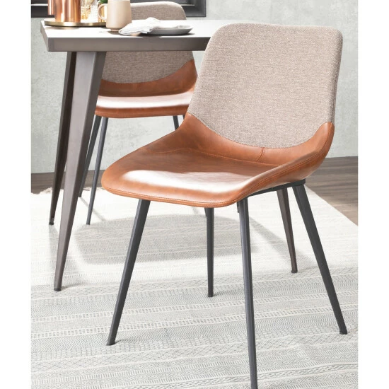 The industrial design of the two-one chair features a two-tone upholstery, suede-like PU and a woven fabric, comfortable high backrest and sleek tapered legs. Use as accent or dining seating, this chair comes in a variety of colors with a black metal base.