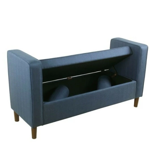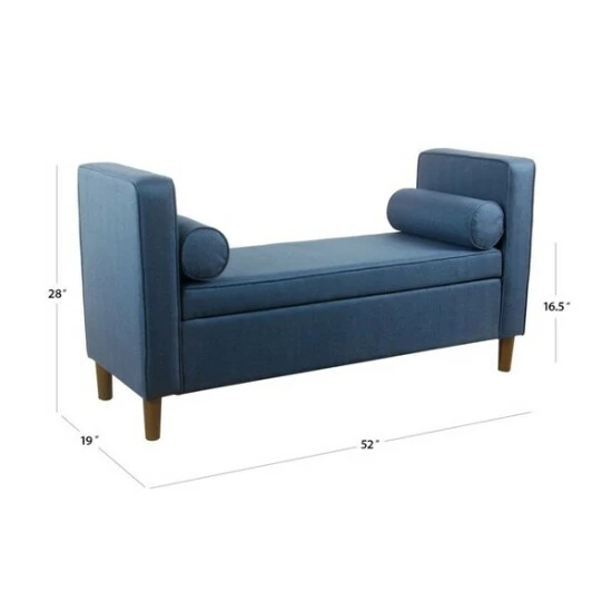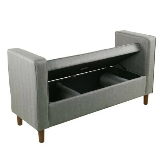 Our Rimo Upholstered Storage Bench features a clean-lined frame, a welted seam and slightly tapered feet in a dark walnut finish. Offering modern mid-century style with the added function of spacious storage, Rimo?s top easily lifts off to store blankets, pillows and more. Covered in a deep gray fabric with a very soft hand, our upholstered storage bench will add a dramatic flair to your bedroom, living room or entry. Two matching bolster pillows are included. Easy to assemble and maintain with spot cleaning as needed.