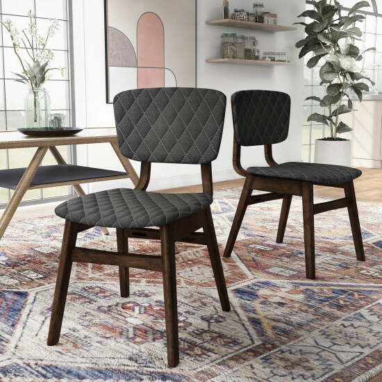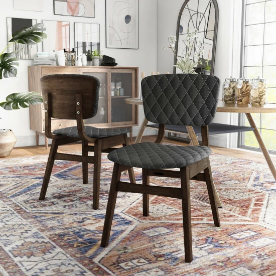 The Mid Century Modern style of these upholstered dining chairs has an understated cool presence, played up by the rich walnut finish of its frame. The simple curved padded backrest and retro inspired quilted upholstery are a welcome break from your conventional dining chair styles.