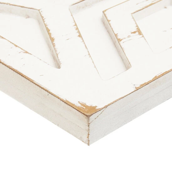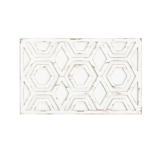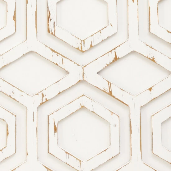 This wall art provides a charming and warm accent to your home decor. This white wooden wall art piece features a hexagonal design in distressed beige wood finish, creating a rustic look. Neither water sealed nor water safe the wall art piece is meant for indoor use only. Easy to hang with hook mounts on the back, this wooden wall art adds a natural touch to your living room or bedroom. No assembly required. Mounting hardware not included.