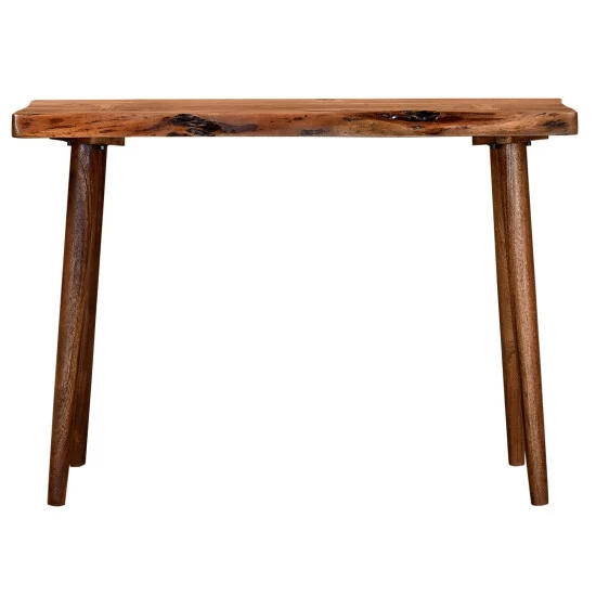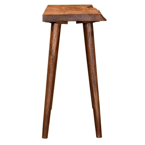 The live edge detailing brings this console table to life along with the naturally occurring solid acacia wood details. Each piece is handcrafted and hand-finished, bringing a unique touch to every rustic table. The narrow width of this wooden console table allows for flexibility of use – in a narrow entryway, or as an accent piece in a living space. The rich walnut finish is the perfect ending to this beautiful piece.
